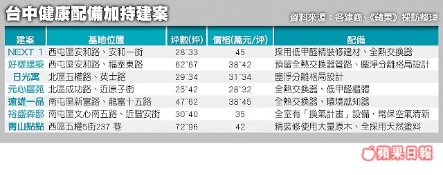 新式建築幾乎都有當層排氣系統,每層樓的衛浴、廚房廢氣直接排出當層外牆,上下鄰居的的廢氣不會經由管道間亂竄至家裡,台中部分個案除了這些規劃,再加碼配備「全熱交換器」,空氣汙染嚴重時,即使門窗緊閉,仍可不斷往室內輸送乾淨新鮮的空氣。 如西屯區「NEXT 1」、南屯區「遠雄一品」等換屋大樓,都配備全熱交換器,每坪38~45萬元,較特別的是屬於中低總價的大樓案「元心璽苑」,專案經理許秉豐表示,以2房800萬左右、3房千萬元左右價位的產品來說,該案是唯一有配備全熱交換器的產品,24小時全開,每月電費也僅增加200多元。 髒空氣除了從室外進來,新房子的地壁面、裝潢、櫃體、家具,也都會散發出刺鼻的溶劑味道,內含甲醛等多種有毒物質,對身體更傷,「NEXT 1」、「元心璽苑」等案,皆從源頭根治,採用合格低甲醛裝潢,西區大樓案「青山點點」更強調塗料「非自然的不塗」。