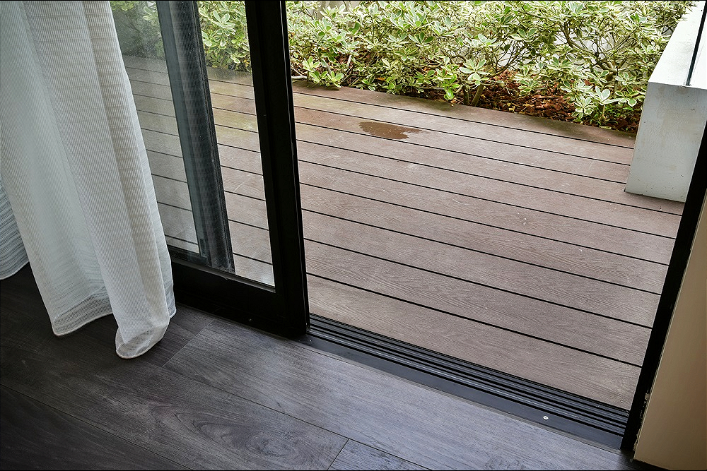 客廳地坪、前陽台落地窗、客陽地坪,三者皆室內外平順。進浴室的高低差降低至2公分差距。