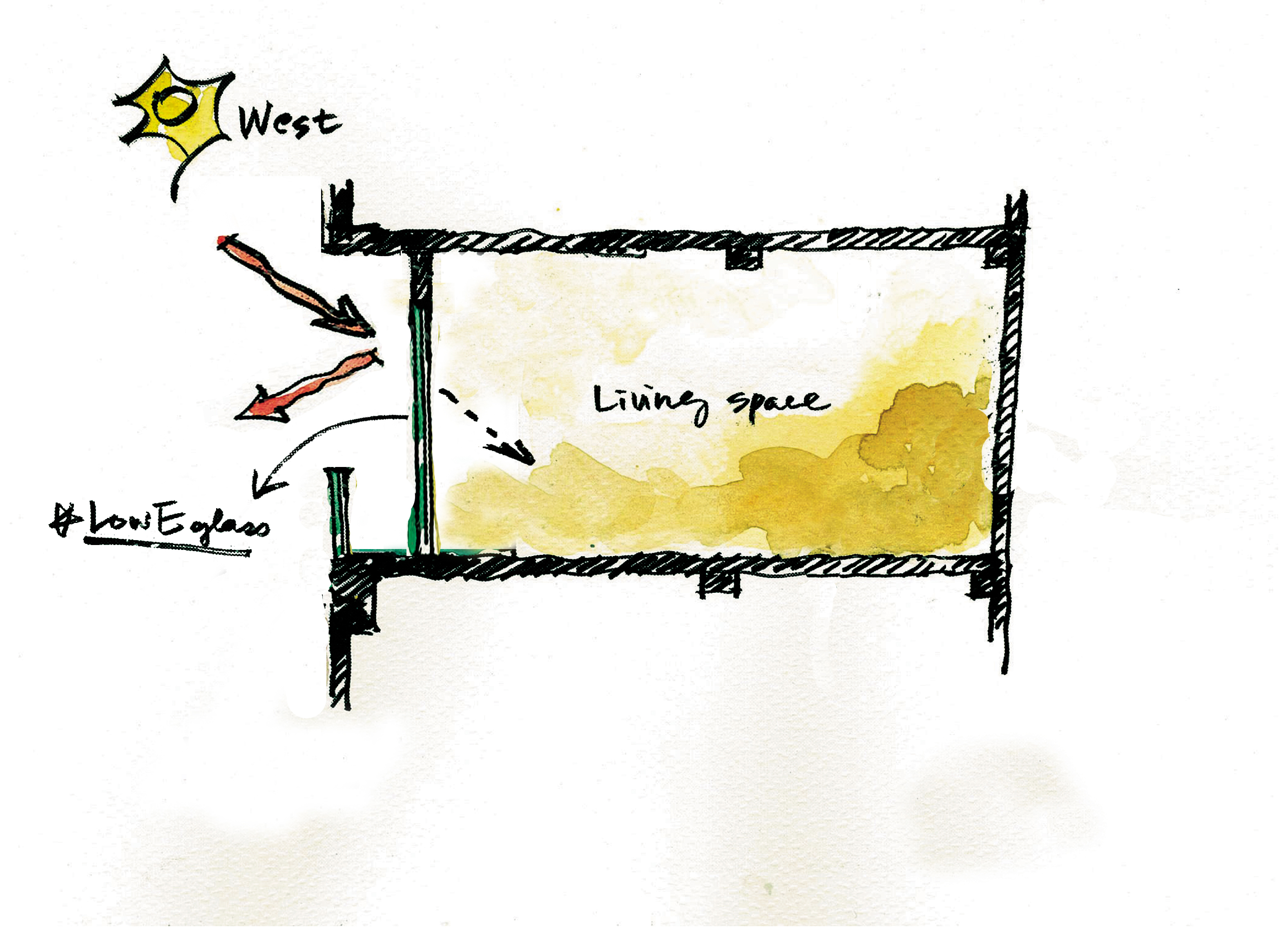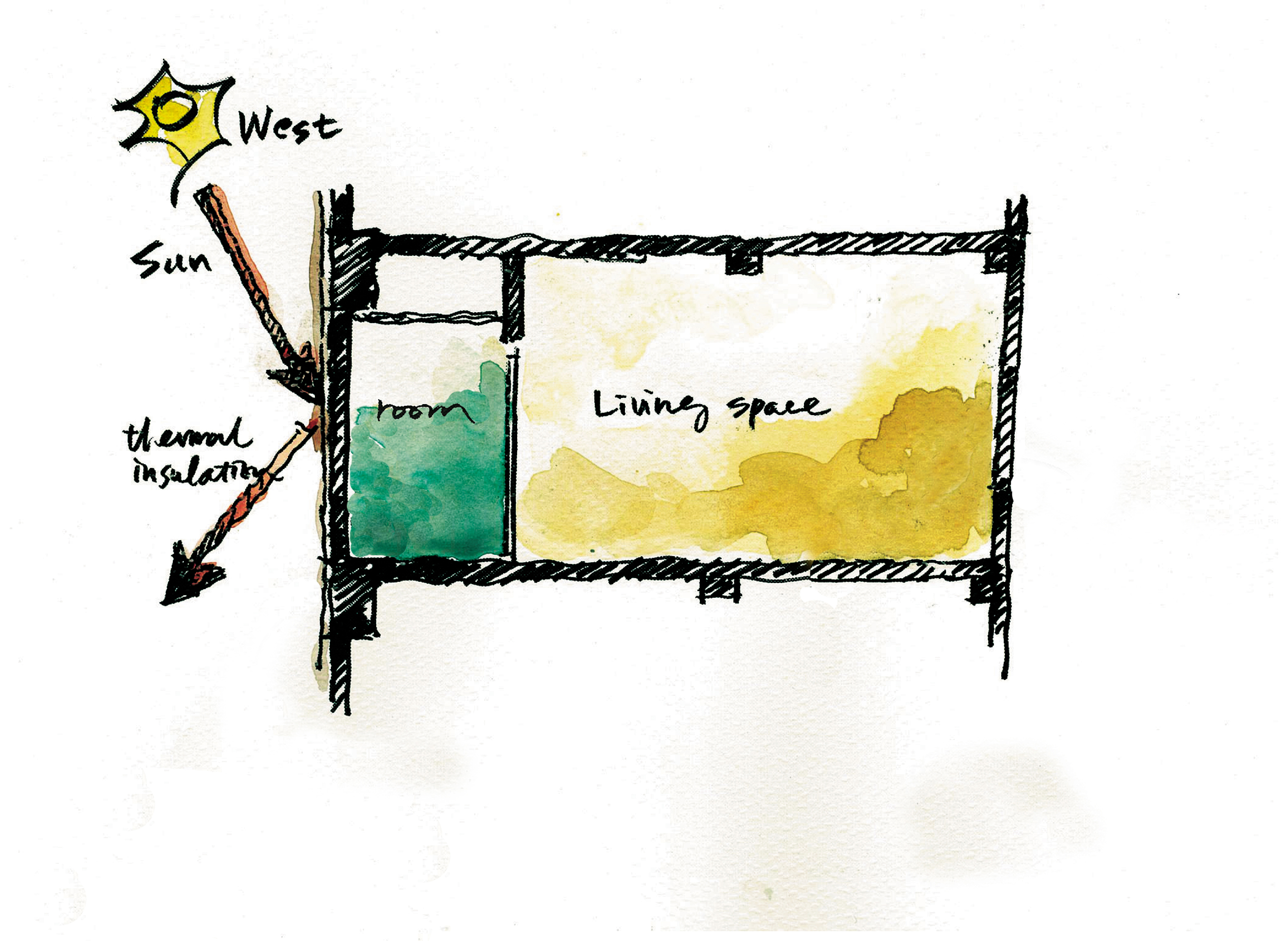 人的體溫大約維持在37℃左右,過冷與過熱都會造成身體不適,居住空間的溫度調節,不得不重視。 好宅要素 一 考量方位,減少太陽直射面積,設置遮陽。 綠適居手法 建築南向設計深陽台及水平雨遮,減少陽光直射;廁所則配置在西向及東向,容易保持乾燥不潮濕。 好宅要素 二 選用適當配備,降低室內輻射熱能流清新。 綠適居手法 西向牆使用雨遮及隔熱砂漿,並於開口窗戶搭配採用LOW-E玻璃,減少熱能傳遞至室內。
