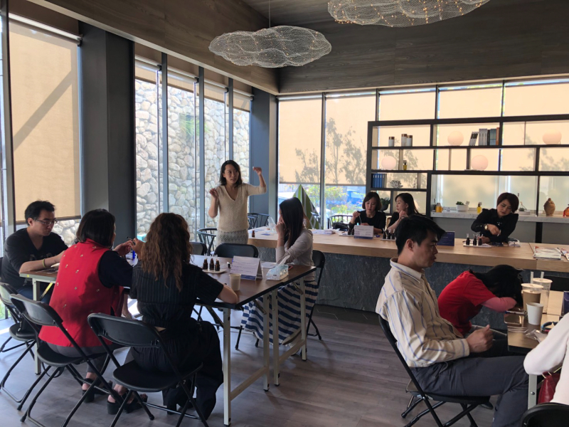 香氛講師Aroma 指導著大家,如何運用前調、中調、後調的香水原料,